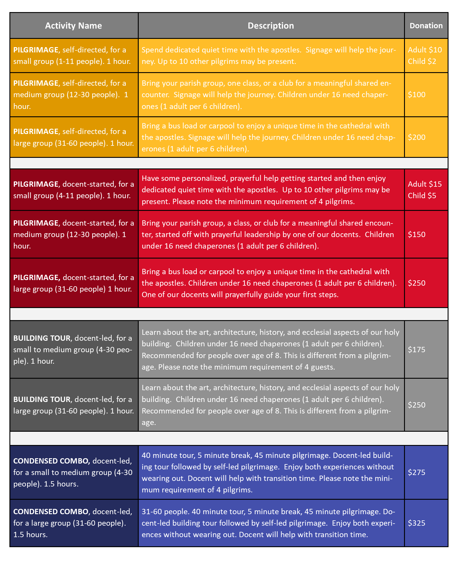 Thank you for being interested in visiting with the Apostles by booking a pilgrimage. Booking guarantees you that the church is available, and that only you and your group (and the saints and angels) will be present.